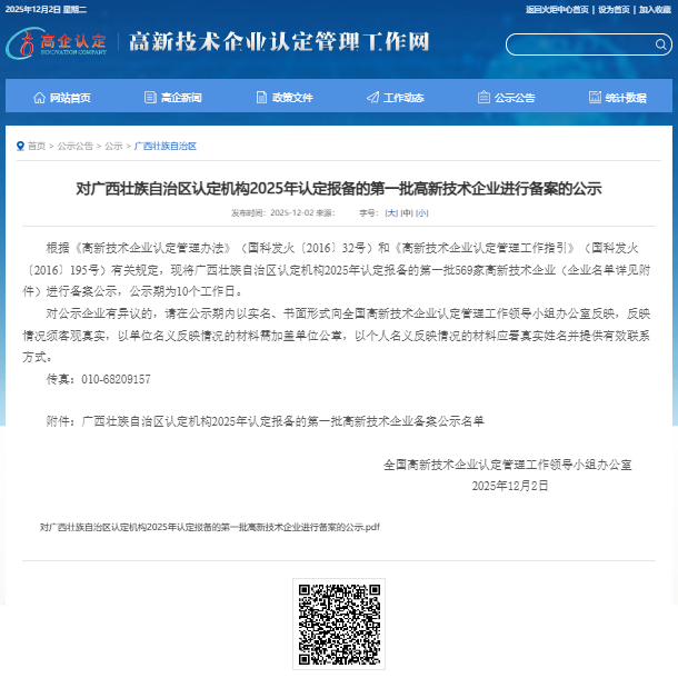 2025年12月2日,全国高新技术企业认定管理工作领导小组办公室公示了广西壮族自治区认定机构2025年认定报备的第一批高新技术企业名单,共计569家。公司通过高新技术企业重新认定。